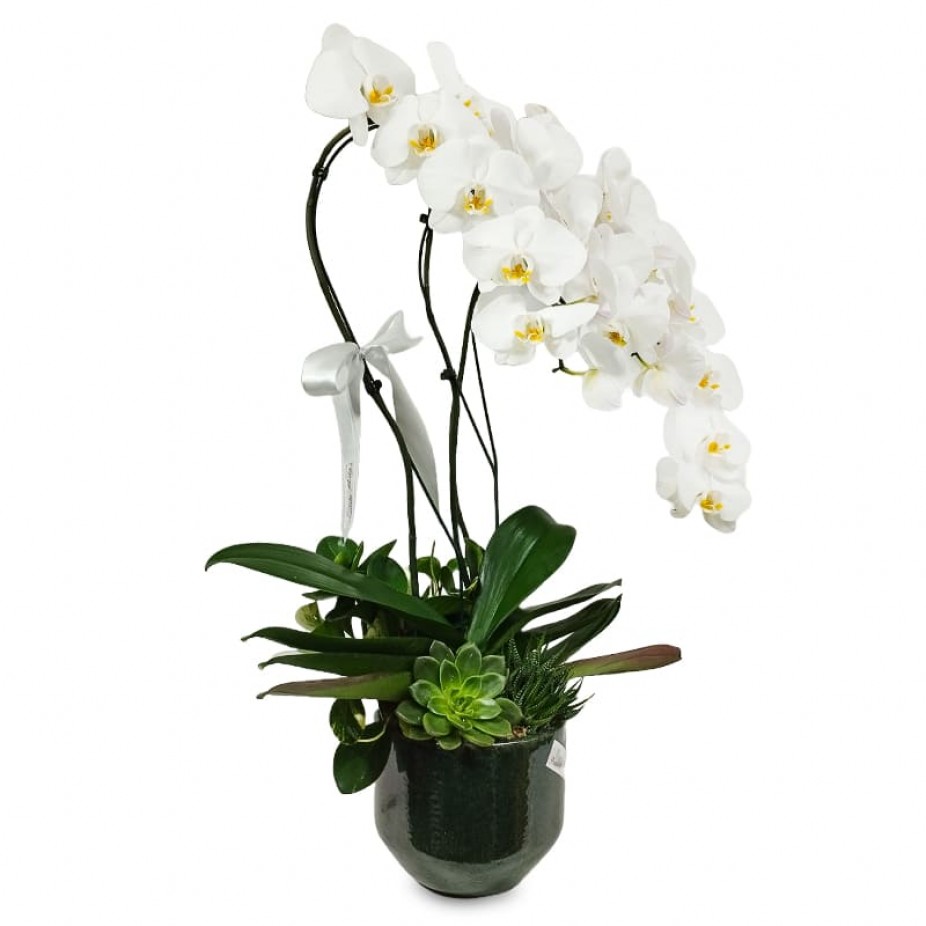 Este vaso de cerâmica com Orquídeas Brancas e Suculentas é um presente elegante e bom gosto para impressionar alguém especial.